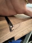 Working on tenons for breadboard ends. I’m doing shallow (~1/8”) passes but got this tearout at the end (walnut). How to I prevent this from happening? Also, what’s the best way to remove the fibers but keep it square and flush? Lightly chisel it off?